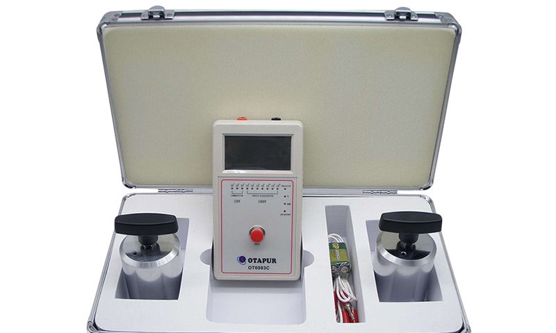 1、儀器的高壓輸出端與測量輸入端分別與兩個電極相連接(屏蔽端空置不用),將導(dǎo)電橡膠按標(biāo)準(zhǔn)要求相隔一定距離置于被測試樣表面,電極放在導(dǎo)電橡膠上。